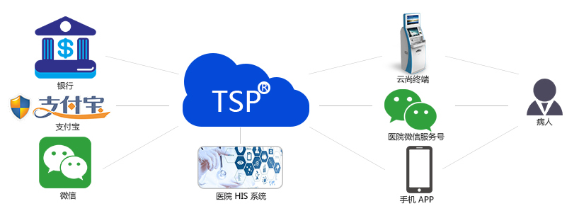 TSP平台打通了医院信息管理系统(HIS)、银行、微信、支付宝,在支撑就医自助终端、微信服务号、手机APP业务实现的基础上,还具备终端的远程运维管理、交易监控、消息分发(微信、短信、邮件、APP)、报表统计、应用管理等功能,为客户提供全方位的增值化服务。