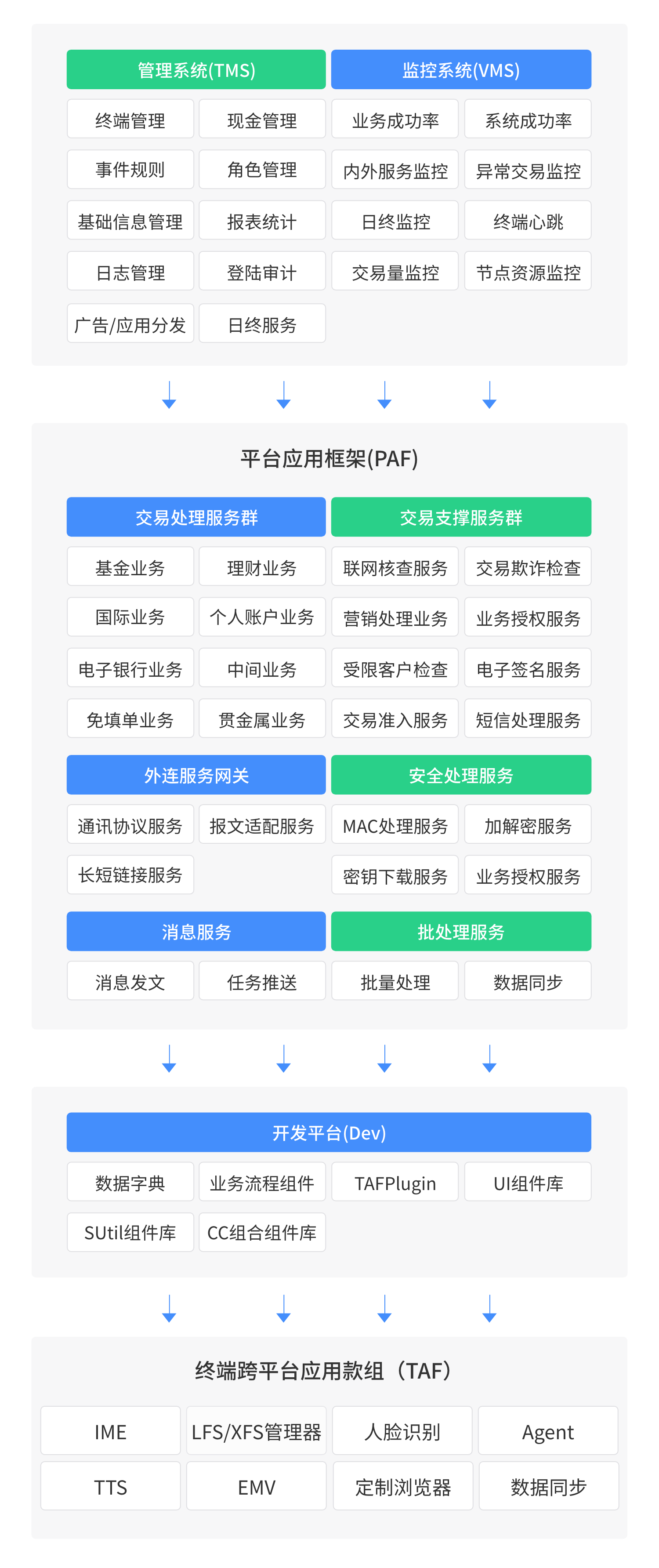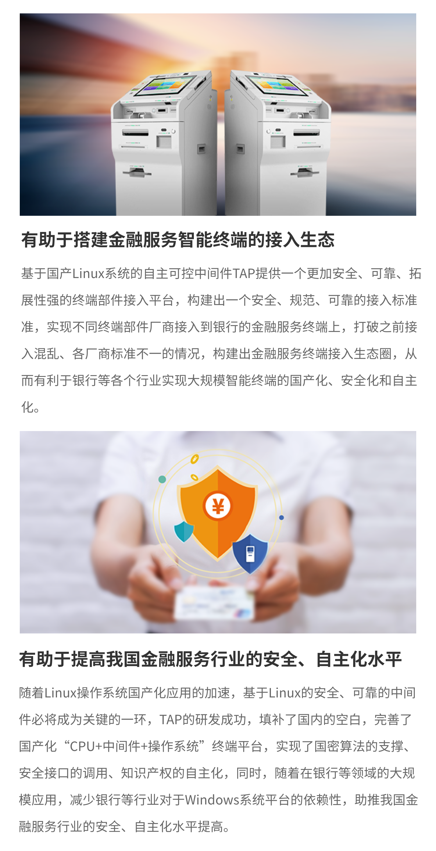 证通自主研发的面向金融领域的自主可控金融中间件平台,是基于Linux下的XFS服务中间件一TAP,通过构建统一金融终端中间件平台,实现接口的统一,从而让金融机构更便捷的接入不同厂家不同型号的部件,同时,通过对国密等算法的支持,构建安全加密服务,保障信息存储、传输的安全性,从而保证金融终端的稳定性、功能连续性、兼容性、灵活性、安全性,助力国产金融系统的安全、自主、可控。