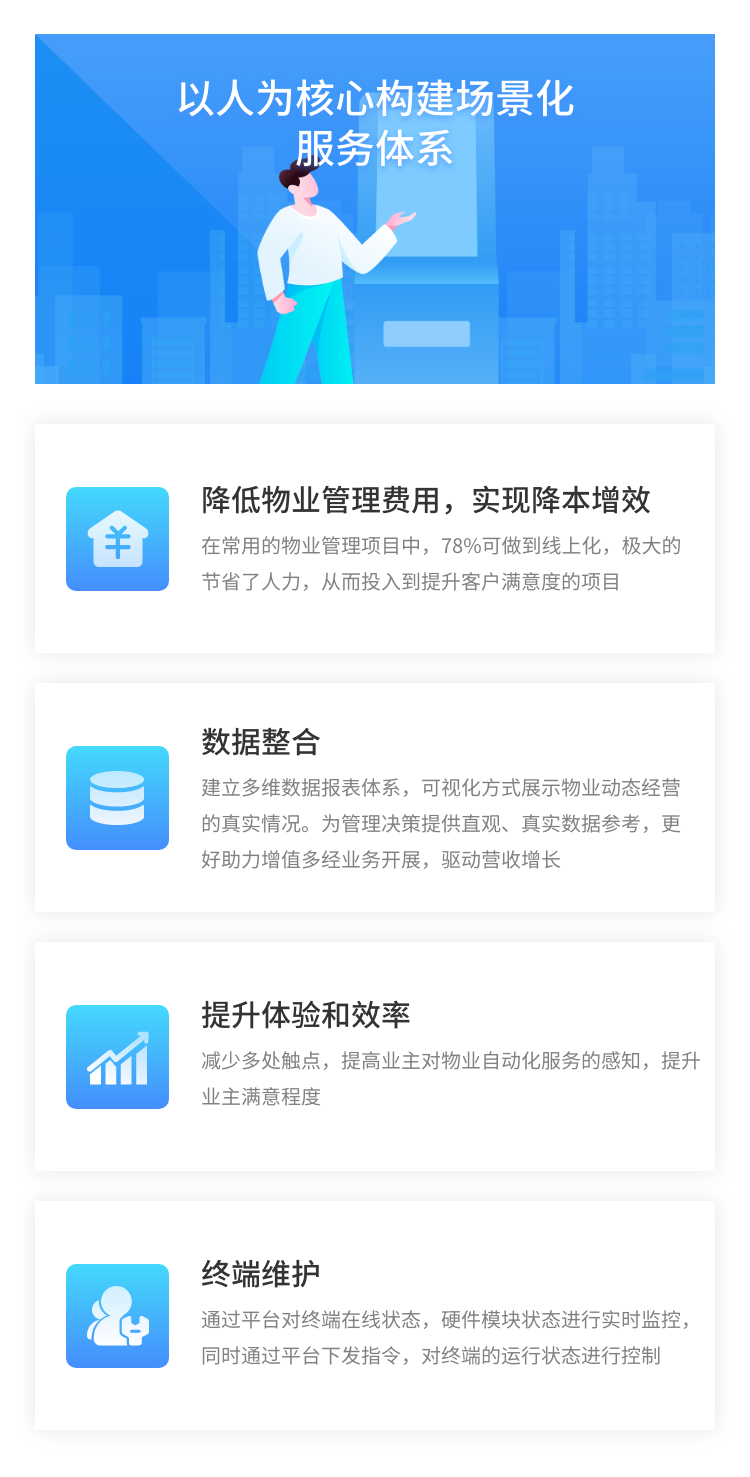 证通智慧物业解决方系统是公司为物业机构客户提供的定制综合一体化解决方案。通过与物业公司内部统一化管理系统进行对接,集成刷脸支付、微信、支付宝、银行卡等多种缴费支付渠道,支持客户使用人脸识别、身份证、指纹等进行身份确认,提供资产委托、影像信息记录、证件打印、住户信息管理、物业缴费、缴纳记录查询、设备状态监控、终端信息维护、人工客服,消息推送、房屋过户、车位过户、便民物资领借用,证明开具、文化宣传、报表统计等全流程物业增值服务,让数据多跑路,让业主少跑路,实现物业费轻松缴、业主零等待、安全居住的物业服务,实现线上和线下的有效互动合作。