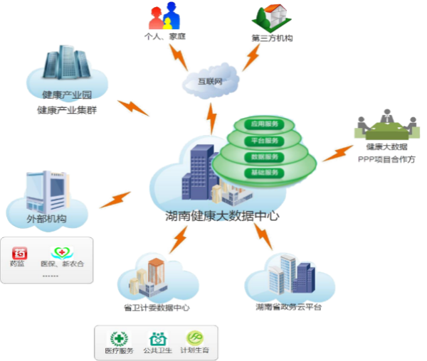 湖南健康大数据中心建设,一方面通过政策配套支持,与湖南省卫生健康委省级数据中心、湖南省政务云平台以及相关外部单位对接,在政策许可、授权监管下,使用现有信息化成果与医疗卫生服务资源;另一方面,通过引入具有丰富经验的医疗健康项目合作单位,基于健康大数据云平台,建设“医疗健康+互联网”应用,并面向个人、家庭、第三方机构开展运营工作,开展健康大数据应用,培育医疗健康服务产业。