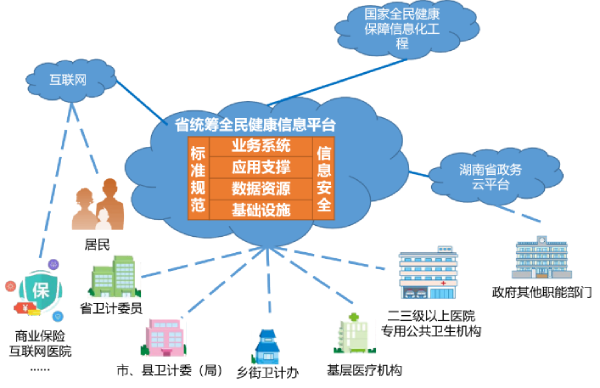 - l 打通政务服务、全员人口、妇 幼保健、疾病控制、卫生监督等条 线业务系统,数据统一整合到省全 民健康信息平台;